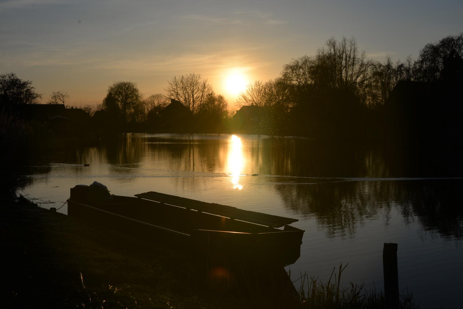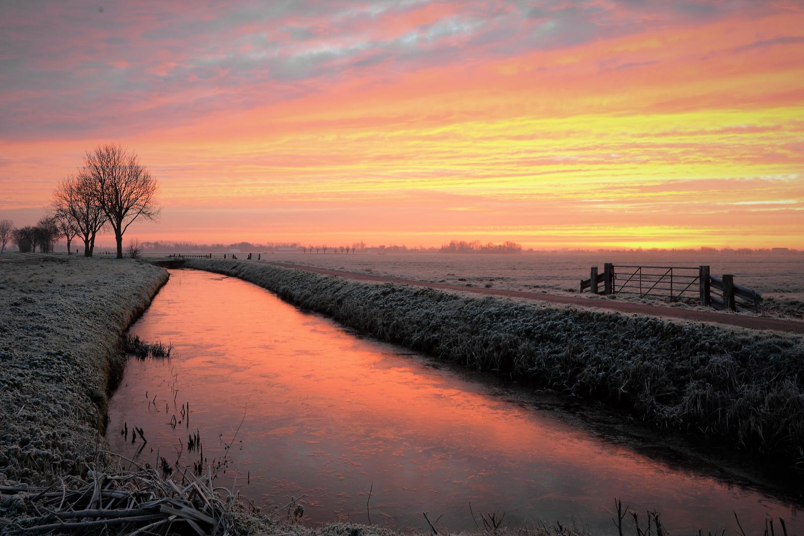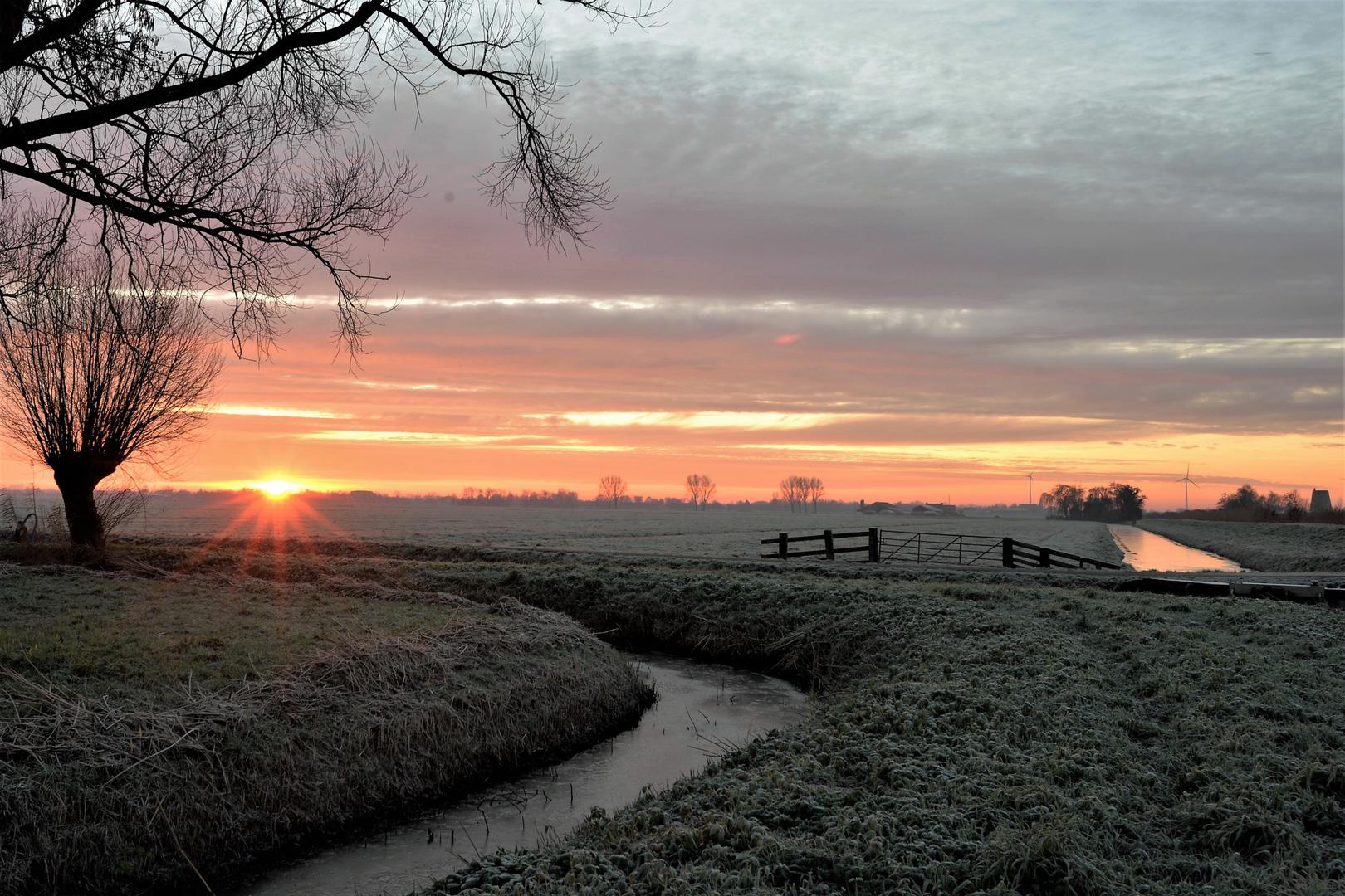 De zon komt op thv de Heideweg in Giessenburg. De polder is licht bevroren